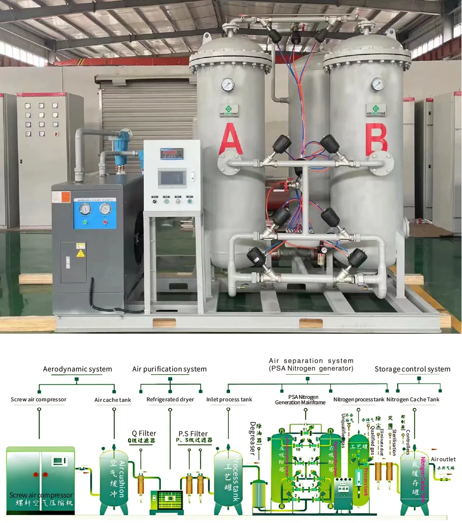 Попереднє охолодження повітря: воно охолоджується до відповідної температури в системі попереднього охолодження під час розділення вільної води. Очищення повітря: Адсорбент видаляє воду, вуглекислий газ та інші вуглеводні в адсорбі.